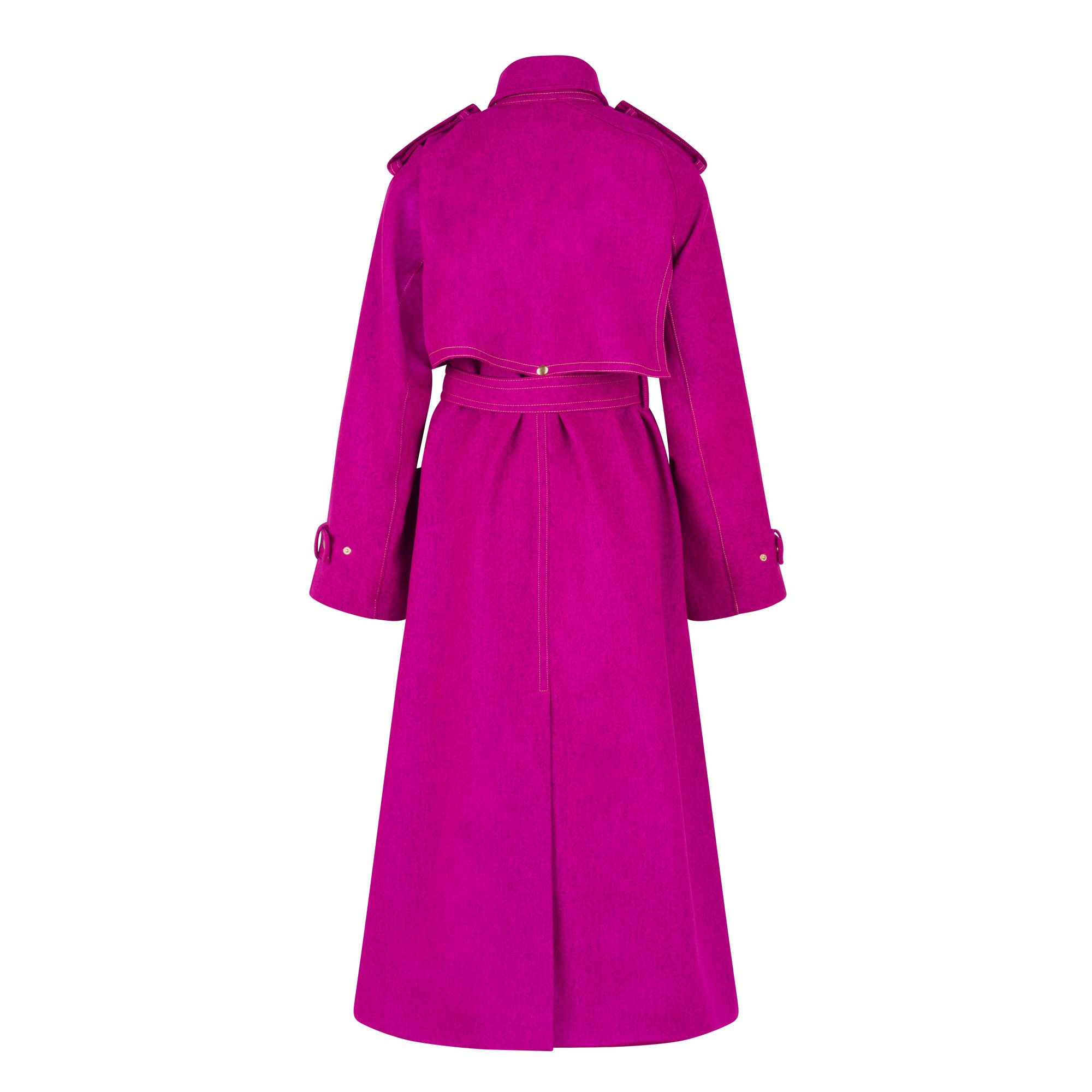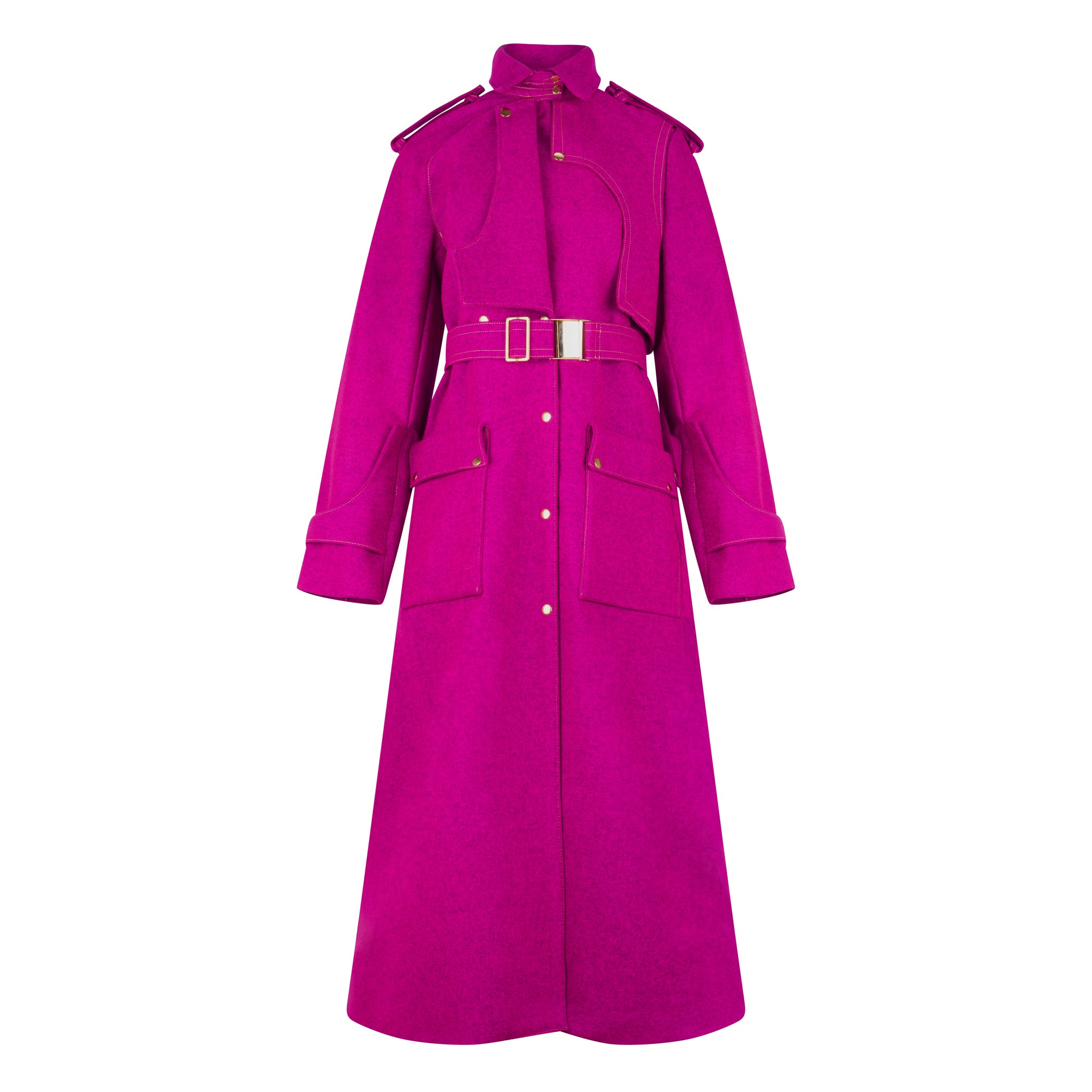 Description: Fully asymmetric full-length coat. The right-hand sleeve is raglan with a nautical cuff tab, and the left-hand sleeve is a set-in sleeve with a nautical cuff tab. Matching shoulder epaulettes. The lapel is asymmetrical as the left hand has a double-breasted lapel with a curve yoke overlay, and the right hand has a nautical single-breasted lapel. The collar is asymmetric, with the left-hand side longer and wider than the right-hand side. This coat comes with a metallic click-in, click-out buckle and adjustable slider to allow the belt to be adjusted to the user’s comfort. This garment comes fully lined with a single vent at the centre back. The back has an oversized yoke flap with a central popper for closure. The main front pockets have 2 entry points, the main entry point has a popper closer, and the second pocket is a welt pocket hidden underneath the pocket flap for privacy.